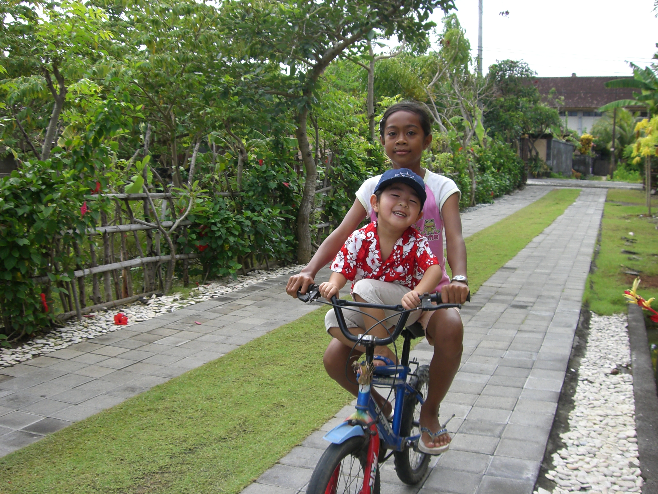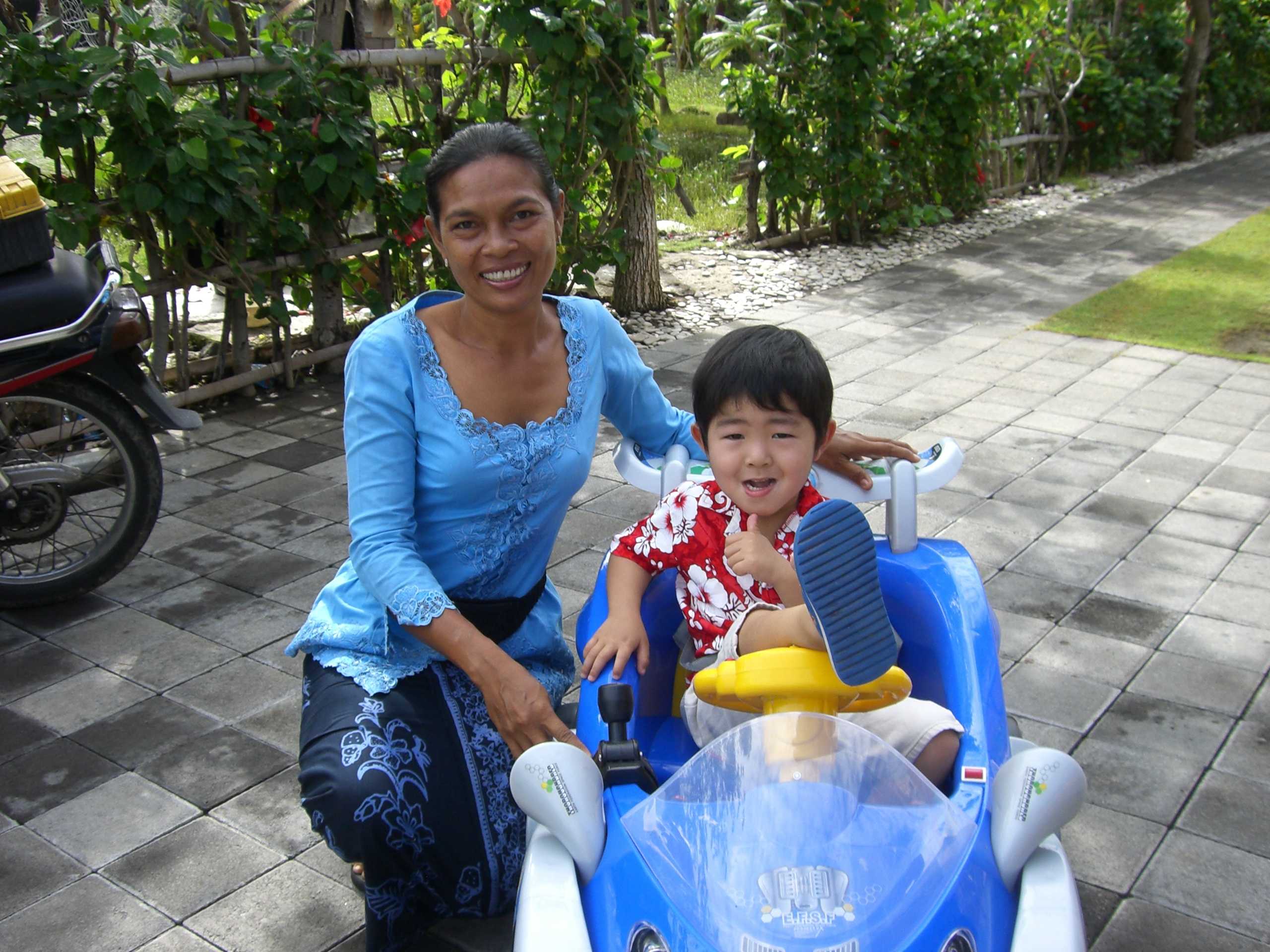 近くのインドネシア人の兄弟が遊びに来る。電気自動車に乗ってドヤ顔のわが子とメイドのクツッツ。わが子のハンドルさばきは秀逸!切り返しはお手の物。私道と一般道路には大きな門があるので、外に飛び出すこともない。フルスロットルで走り回る。家の前の私道だから車は入ってこない。放し飼いのサピ(牛)は入ってくるけど。
