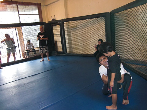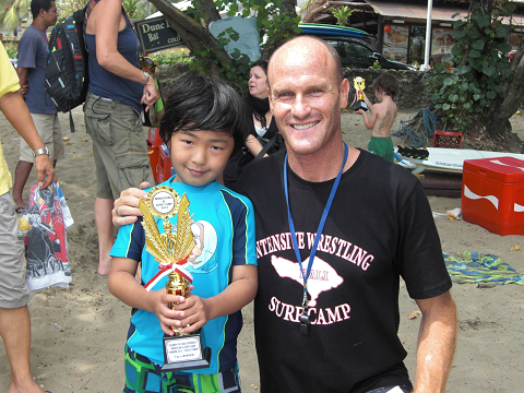 ニコ(Niko Han)が我が子たちの師匠です。とても優しい面持ちで丁寧に教えてくれます。“レイちゃんの海外移住計画singapore 柔術MMAのある生活”で結構詳しく紹介されています。お店の常連様のMさんの紹介でMMAの道場(Dojo Aora)に通い始めました。Mさんの息子も以前から通っています。かなり、出来る!クーラーも入っていない道場です。年に2回だったかな?HIGH INTENSITY WRESTLING AND SURF CAMPが開催されます。”SURVIVOR”には金ぴかのトロフィーが貰えます。我が子ももらって大喜び!MMAだけでなくサーフィンも覚えます。たまに道場から出て、ビーチでサーフィン。バリ島だからね。写真に一緒に写っているのはニコじゃないトム。我が子のSISの先生。これもやっている。